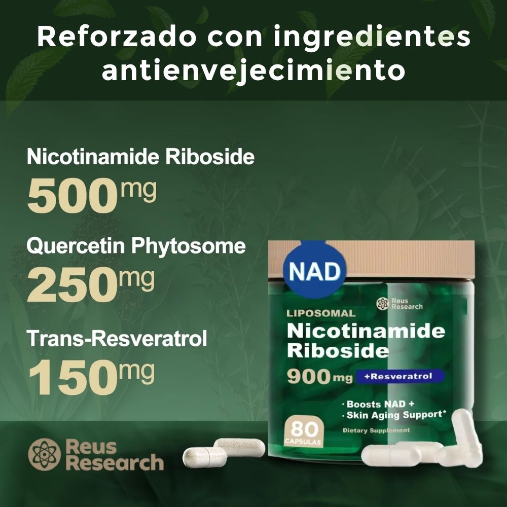 🔬 900mg de Nicotinamide Riboside 💧 Tecnología liposomal para máxima absorción 🧴 Con Resveratrol, el antioxidante de la juventud 🧘♀️ 100% natural, sin rellenos ni químicos 📦 80 cápsulas por frasco (dura más)